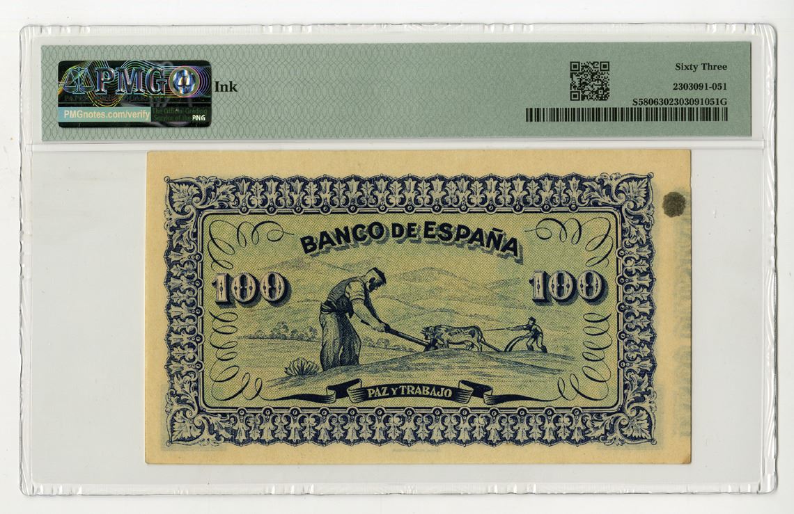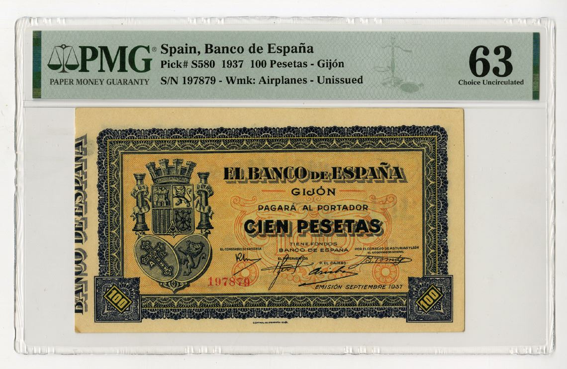 Gijon, Spain, 1937. 100 Pesetas, P-S580, Unissued Banknote, Blue on orange underprint with arms at left, Back is blue on green with farmers working field at center, S/N 197879, PMG graded Choice Uncirculated 63 with comment "Ink."
