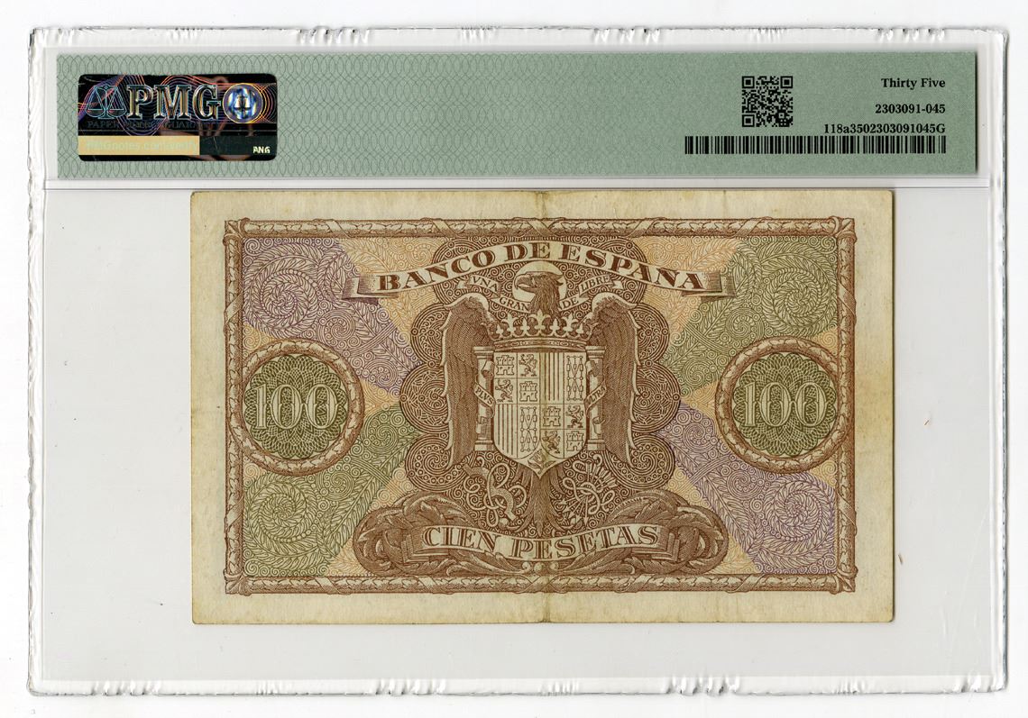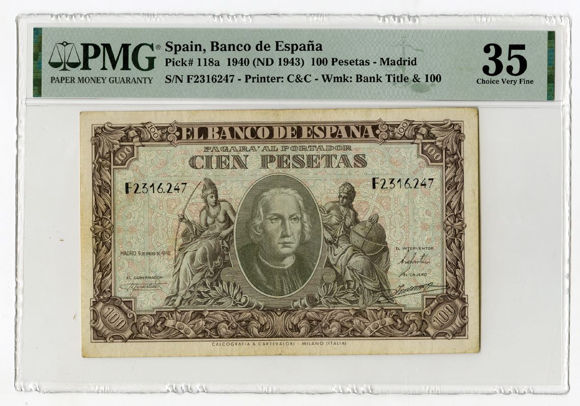 Madrid, Spain, 1940 (ND 1943). 100 Pesetas, P-118a, Issued Banknote, Lilac-brown on green underprint with portrait of Columbus at center and allegorical figures at either side, Back is brown and m/c with arms at center, S/N F2316247, PMG graded Choice Very Fine 35, C&C.