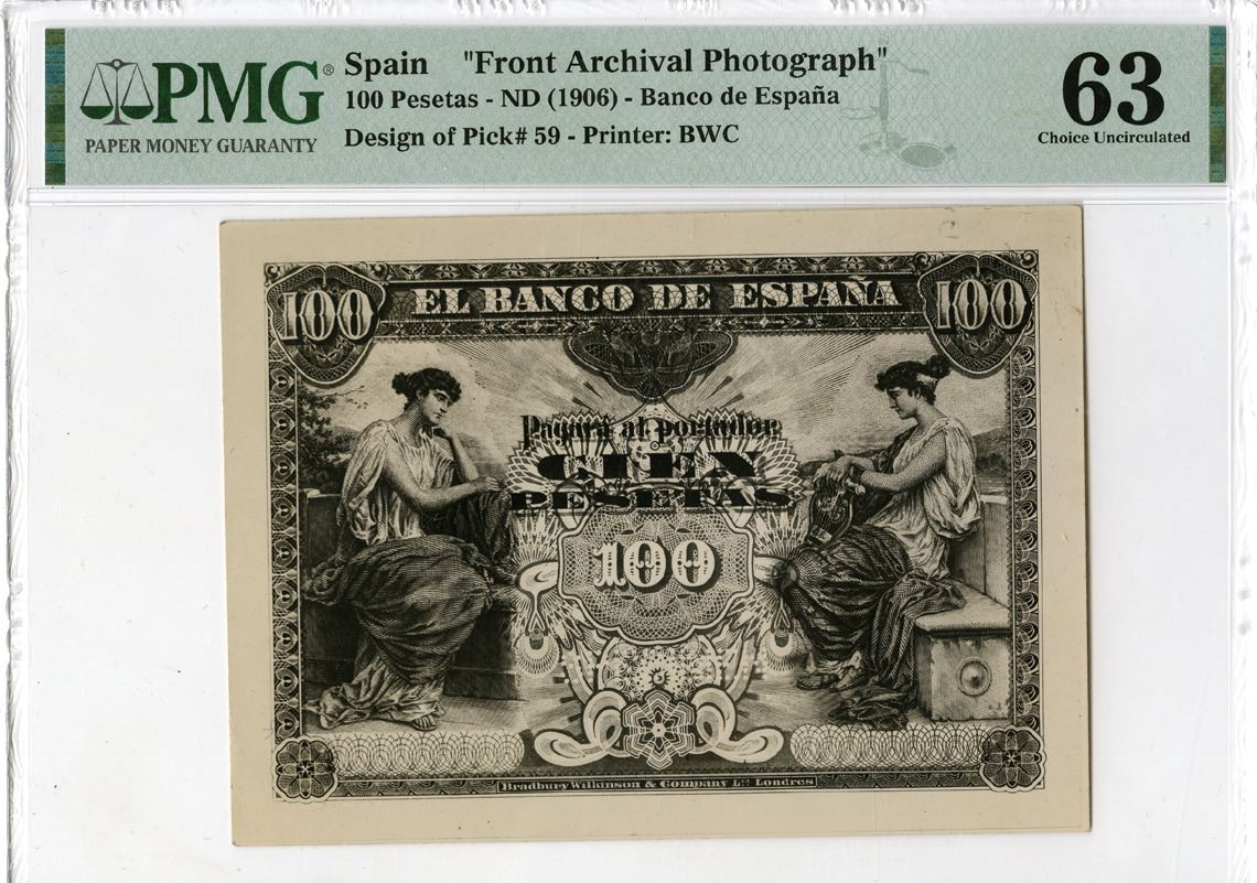 Spain, ND (1906). 100 Pesetas Front Archival Photograph of Design used on P-59, Black and white print with allegorical women at center, PMG graded Choice Uncirculated 63 with comment "Tear." This photo proof of the original specimen note was used during the production process to determine if the design and text were correct and also used for approvals and the printing company's records. This was from the Bradbury, Wilkinson & Co. Ltd. production and design department.