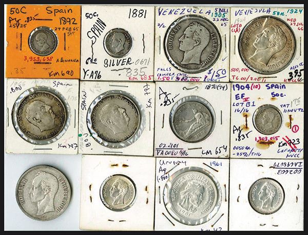 Spain. 1881 50 Centimos VG-Fine; 1892 50 Centimos Fine, 1904 50 Centimos EF, 2 Peseta 1874 VF, 100 Pesetas 1966 BU(2). Uruguay - 1961 10 Pesos BU. Venezuela - 1945 Bolivar BU; 1965 Bolivar BU, and the following 5 Bolivares – 1886 & 1889 VG-F, 1905 Fine, 1911 F-VF, 1912 VF, 1924 VF, 1924 BU; 1935 VF. Must be seen, sold as is, no returns. [17]