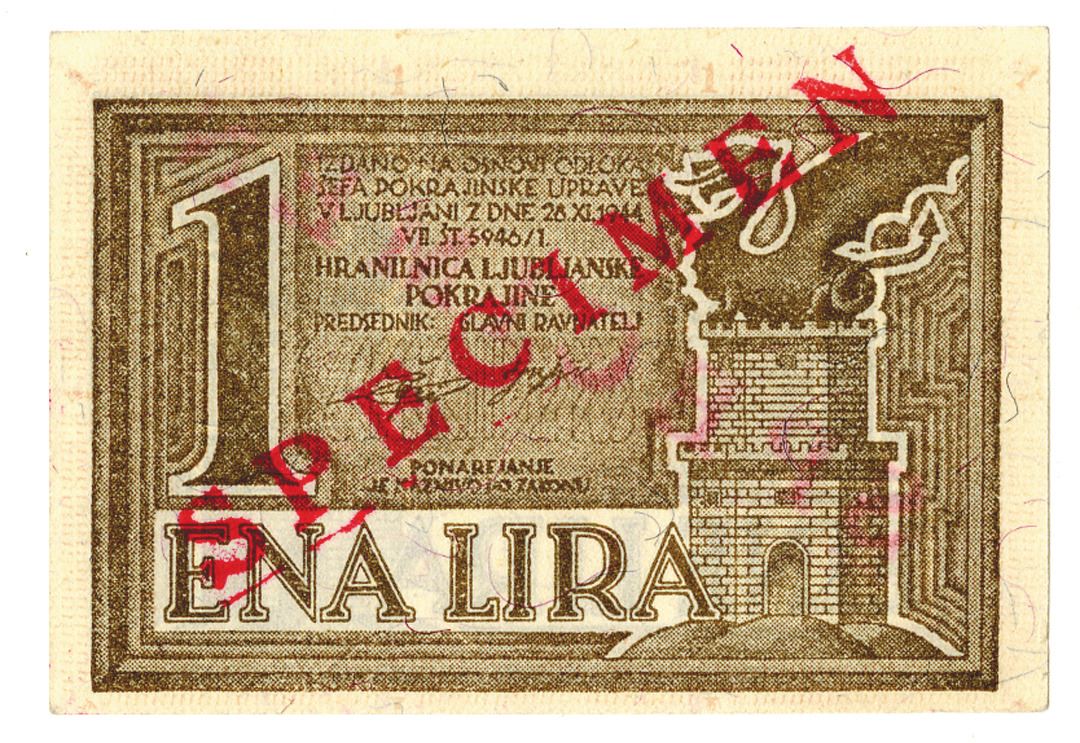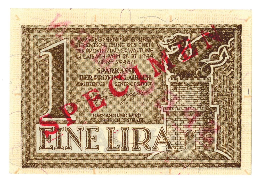 Yugoslavia. 1944. 1 Lira, R17s, specimen banknote, German Occupation of Ljubljana, overprinted "SPECIMEN" in red, Uncirculated to CU condition. Attractive and rare.