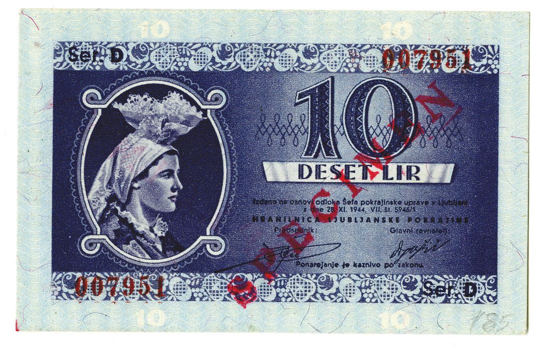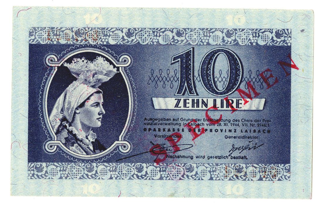 Yugoslavia. 1944. 10 Lir, R20s, specimen banknote, German Occupation of Ljubljana, overprinted "SPECIMEN" in red, Uncirculated to CU condition. Attractive and rare.