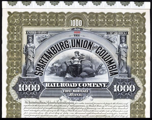 South Carolina, 1895, $1000, 1st Mortgage 4 % Gold Bond, Specimen Bond, Black on olive green border and underprint, Seated Commerce with barrels, bags and casks of goods in middle flanked by Standing allegorical woman as columns on left and right, bottom with slave carrying cotton, Coupons attached, VF-XF condition, ABNC.