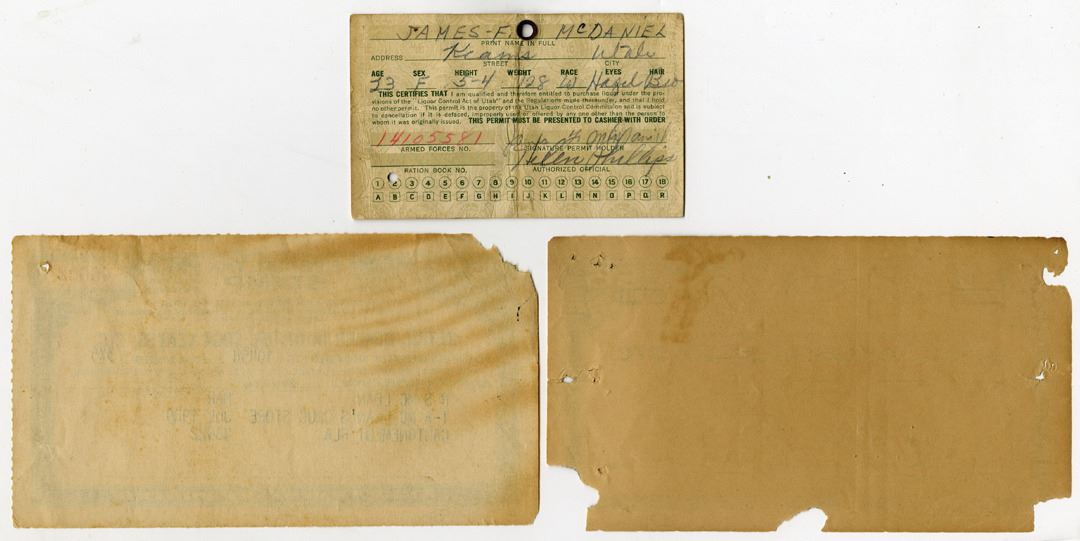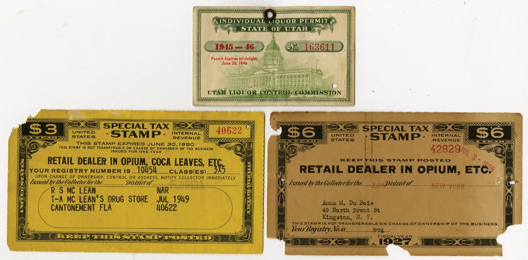 Florida, New York, & Utah, 1927-49. Trio of Issued Certificates, Includes: $3 U.S. Internal Revenue Special Tax Stamp issued for a Florida retail dealer in "Opium, Coca Leaves, Etc" for the fiscal year of 1949, Registry number 10454, Black on yellow paper with top left corner missing; $6 Issued U.S. Internal Revenue Special Tax Stamp issued for a New York Retail Dealer in "Opium, Etc." for the fiscal year 1927, Registry Number 776, Black text on brown paper, pieces missing along margins and some holes, staining from a paperclip at top center; 1945-46 Individual Liquor Permit from the State of Utah, and issued by the Utah Liquor Control Commission, allowing the holder, James F. McDaniel, to purchase liquor, Green text with U.S. Capitol building underprint in green, Fine condition with some staining. (3) Sold "AS IS" no returns accepted.