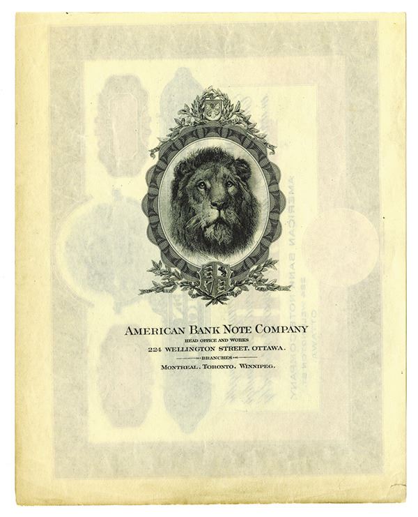 Ottawa, Canada, Odd Shares, Specimen Sample stock certificate, Beaver at top middle over title, Smaller text states that this is an example of design and workmanship prepared by American Bank Note Co., Ottawa. Back has famous lion portrait by Smillie in middle with ABNC address below it, appears uncirculated but there is a 4mm tear in the excess margin on the lower right margin away from design. Attractive and rare design. ABNC.