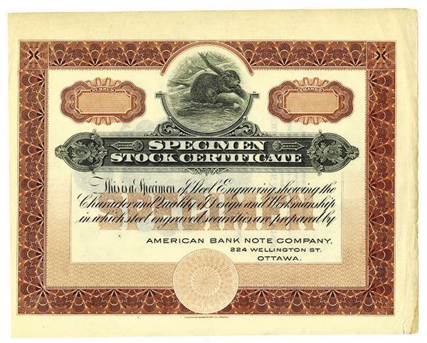 Ottawa, Canada, Odd Shares, Specimen Sample stock certificate, Beaver at top middle over title, Smaller text states that this is an example of design and workmanship prepared by American Bank Note Co., Ottawa. Back has famous lion portrait by Smillie in middle with ABNC address below it, appears uncirculated but there is a 4mm tear in the excess margin on the lower right margin away from design. Attractive and rare design. ABNC.