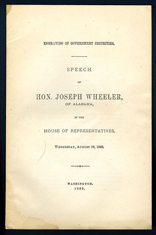 Washington D.C, August 29, 1888, Speech of Hon. Joseph Wheeler of Alabama in the House of Representatives Regarding Engraving of Government Securities, 15 page booklet, VF condition with minor toning.