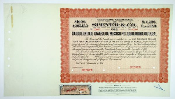 Mexico... Specimen Temporary Certificate of Speyer & Co. for $1000 United States of Mexico 4% Gold Bond, black print on orange border and under tint, large margin to the left, one $20 coupon attached at bottom, Specimen overprints and POC's, VF-XF condition, ABNC.