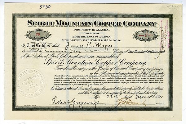 Alaska (Inc. in AZ). 1911, 5 Shares I/U Preferred Stock Certificate. Black text and border, no underprint. No vignette. S/N 76, XF condition.