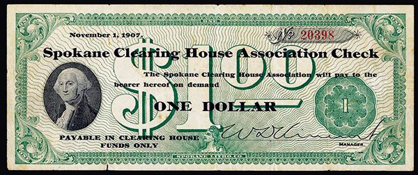 Spokane, Washington. Nov.1, 1907, $1, P-Unlisted, Issued panic or depression scrip. Black printing with vignette of George Washington on left over green border and underprint, back printed in orange. S/N 3085. Attractive Fine to VF condition. Scarce Panic scrip banknote. Spokane Litho.