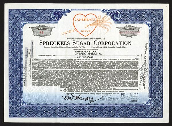 Delaware. 1000 Shares Preferred Stock Certificate, Issued and Uncanceled. Black ink with blue border and under print. Vignette of an orange heart with a sugar cane plant going through. Low certificate number, 29. VF, Broun-Groen Co. Printers.
