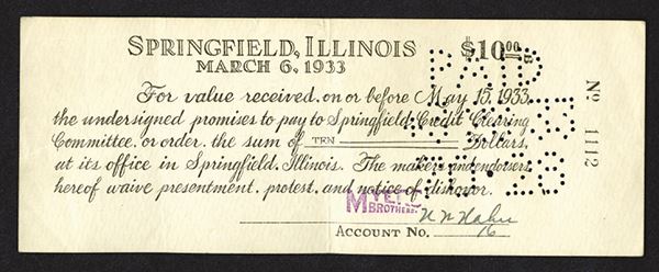Springfield, Illinois. May 1933 Depression scrip for $10.00 Myers Brothers account #16. Endorsed on back and perforated cancelled. Very Fine.