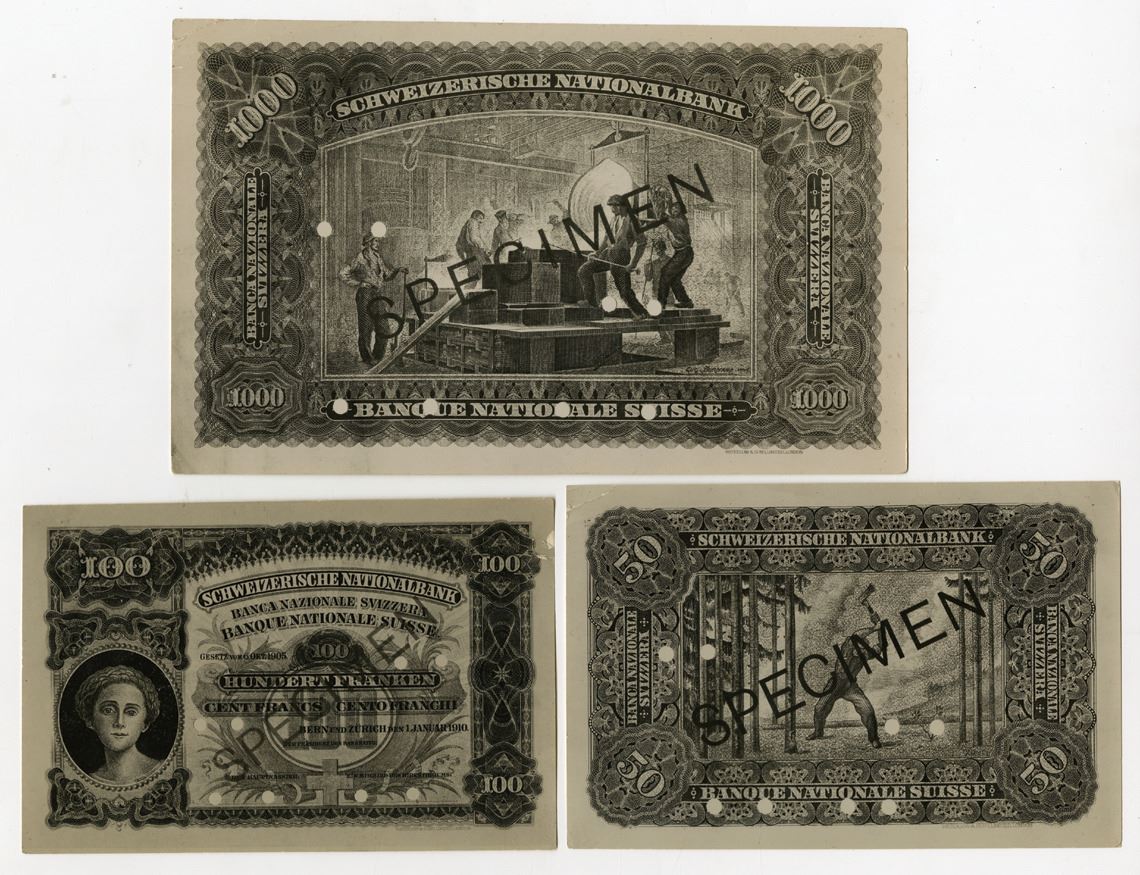 Switzerland, 1910. Lot of 3, Obverse and Reverse Photo Proofs of Varying Denominations: 50 Franken Reverse Proof, P-5p, ND (1910-20), W& S; 100 Franken Obverse Photo Proof, P-6ap, 1910, W& S; and, 1000 Franken Reverse Photo Proof, P-8p, ND (1910-17), W&S. Proofs range from VF to XF condition. (3). Sold "AS IS" no returns accepted. Printed on photo paper,. The photo proofs of the original notes were used during the production process for comparison of designs and text and for reference. Original photo-proofs from the Thomas De La Rue production and design department.