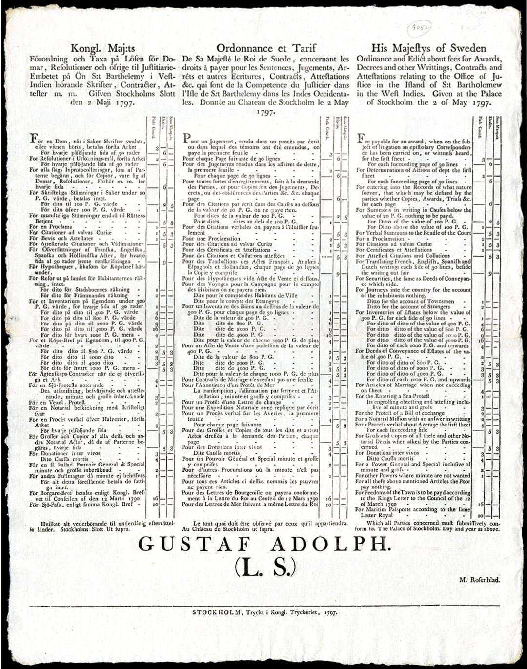 St. Bartholomew, West Indies, and Stockholm, Sweden, May 2, 1797, 54 x 41.5 cm. Broadside with Trilingual notice of legal fees in the island of St. Bartholomew, around 40 different legal services are listed, A line toward the end states "the poor pay nothing", Written in Swedish, French and English, Sweden took over the island in 1784 when it was purchased from France and controlled it until 1878, Unused and untrimmed margins as issued in excellent fresh condition, Printed in large bold type at bottom "Gustav Adolph. (L.S.), Only 3 other copies of this document are known. Rare and historic early West Indies document.