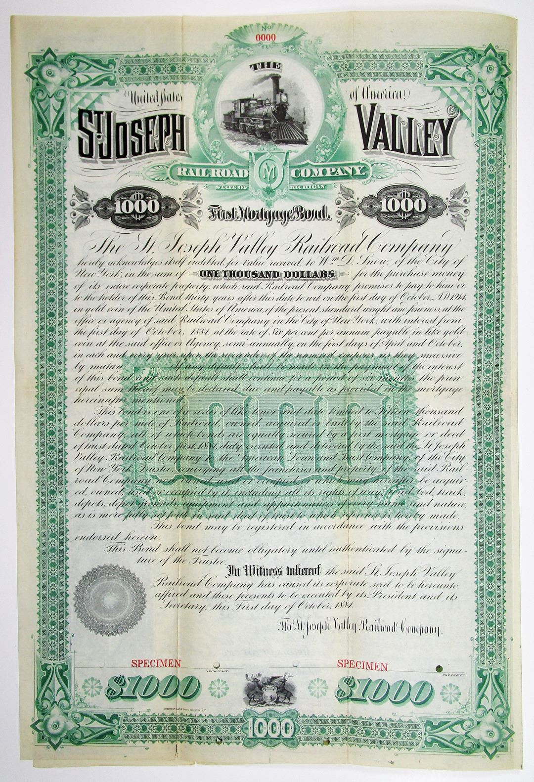 Michigan, 1884. $1000 Specimen 6% First Mortgage Coupon Bond, Black text with green border and undertint, Train on tracks in circular frame at top center. Red specimen overprints, 0000 serial number and POCs. Fine condition with some splitting along fold lines, ABNC. Only listed in proof format in Cox, This is the only example found in the ABN Archives in 2002.