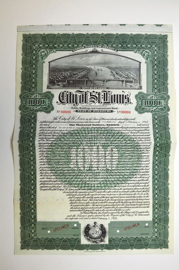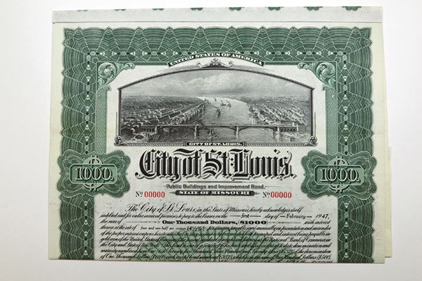 Missouri. $1000 Coupon Bond for Public Buildings and Improvement Specimen. ABNC. Extremely Fine.