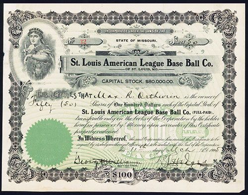 Missouri, 1905, 50 Shares, Issued Stock, #32, Black print with ornate black border and green underprint, Vignette of allegorical woman holding shield top left with green seal bottom left, VF condition with small bit of lower right corner missing.