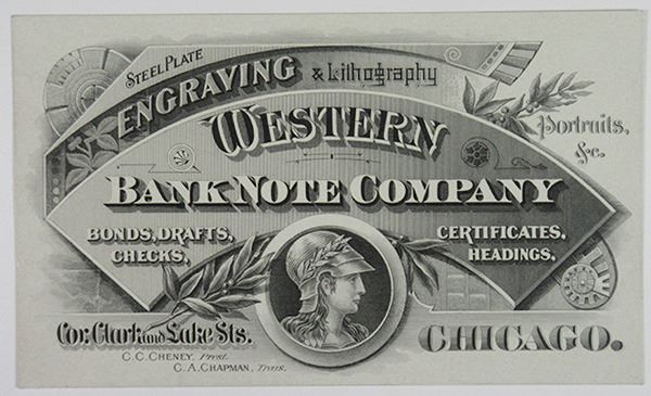 St. Louis, Missouri. ND (ca.1870-80's) Business Card - Trade Card for St. Louis Bank Note Co., 5 x 3 inches, printed in dark green on thin pink colored card, the card lists the different products they print, Ornate intaglio engraving. The company was located at 409 N. Fourth St., St. Louis. The back has to areas of paper from previous mounting attached. Appears Uncirculated from the face. Rare and attractive and first time offered by us. St. Louis BNC eventually was acquired by Western BNC which ended up with ABN. Rare.