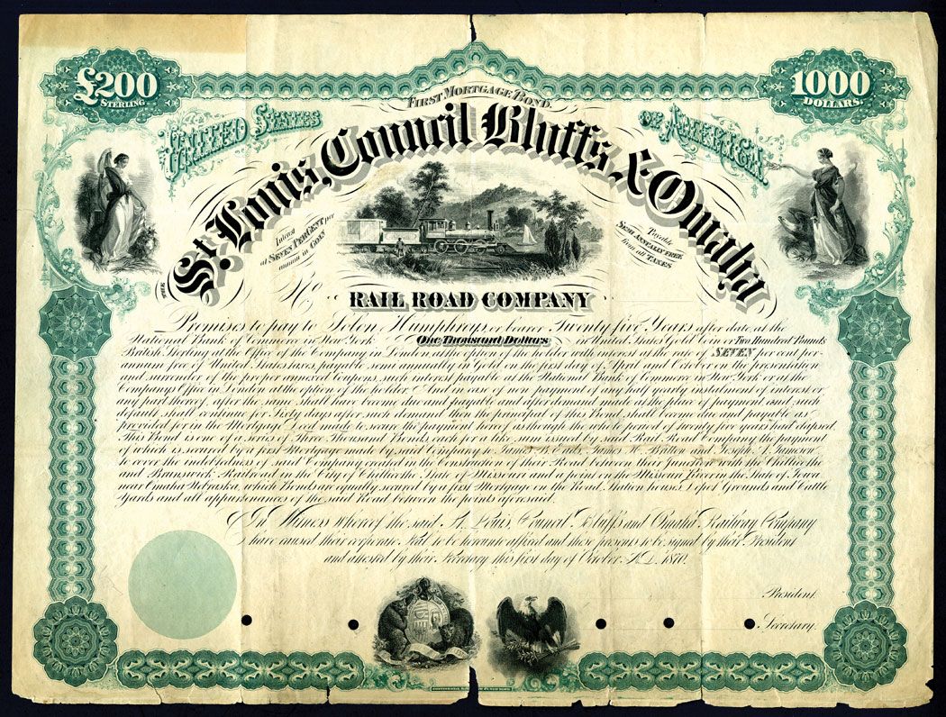 Iowa and Missouri. $1000 - 200 Pounds, 1st Mortgage 7% Gold Specimen bond, Green border with multiple vignettes with train at top middle L-R, allegorical women on upper corners and arms at bottom, There is small piece of the bond missing .75 x .25 inches in bottom middle fold, POC's toning and small edge faults on bottom as well as a small spit on top middle border, otherwise VG to Fine condition. The bond was issued to pay for their lines between their junction with the Chillicothe and Brunswick Railroad and a point on the Missouri River in the state of Iowa. Rare and possibly unique specimen. Continental BNC.