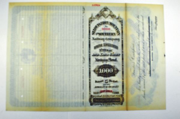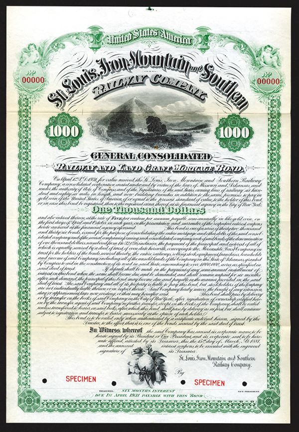 Missouri & Arkansas, 1881, $1000 5% General Consolidated Railway and Land Grant Mortgage Specimen Bond, Black printing with green border and underprint, Moving locomotive top center passing Iron Mountain, POC's and red SPECIMEN overprints, VF condition, ABNC. Listed railroad and bond in Cox.