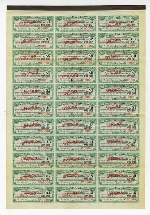 Missouri & Arkansas, 1881, $1000 5% General Consolidated Railway and Land Grant Mortgage Specimen Bond, Black printing with green border and under print, Moving locomotive top center passing Iron Mountain, POC's and red SPECIMEN overprints, VF condition, ABNC. Attractive design and rare as a specimen bond.