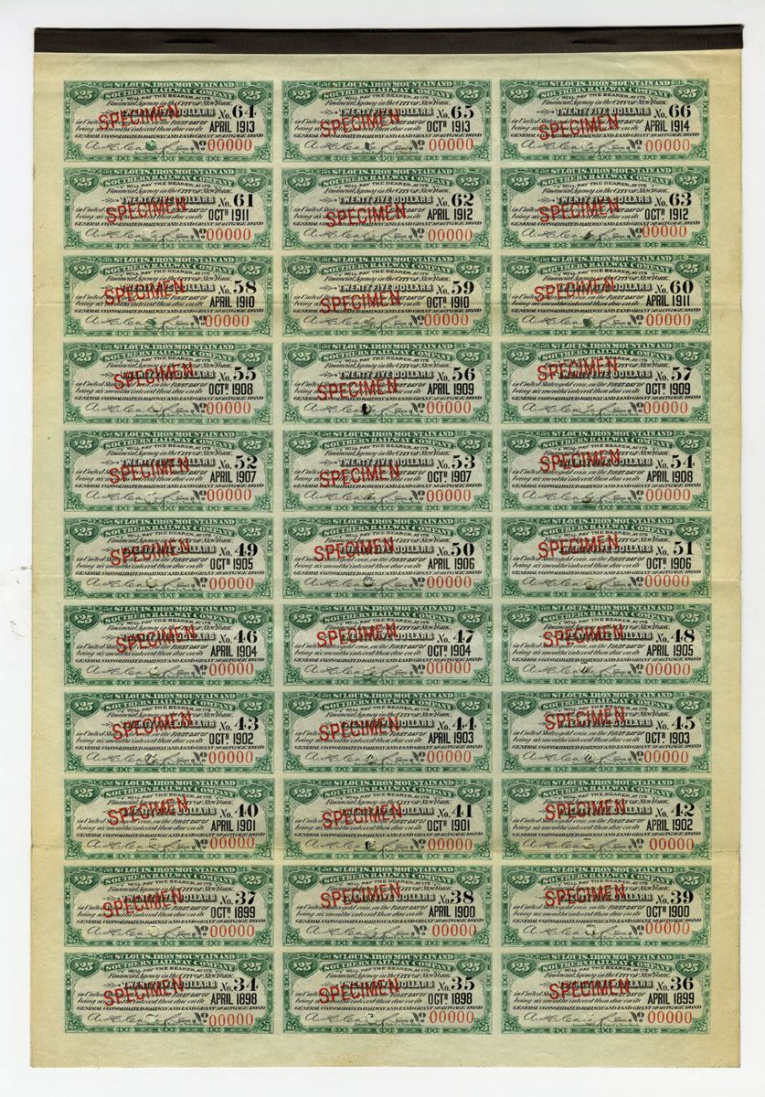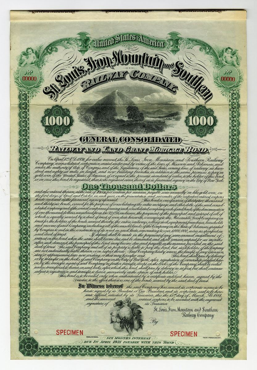 Missouri & Arkansas, 1881, $1000 5% General Consolidated Railway and Land Grant Mortgage Specimen Bond, Black printing with green border and under print, Moving locomotive top center passing Iron Mountain, POC's and red SPECIMEN overprints, VF condition, ABNC. Attractive design and rare as a specimen bond.