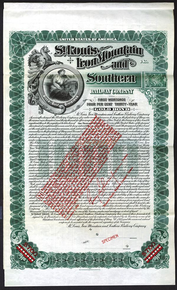 Missouri. $1000, Specimen 1st Mortgage 4% Gold Coupon Bond, Vertical format, black on green border and undertint, Allegorical woman on top left in circle with Gryphon on top, Overprinted in red diagonally with information on new payment terms, VF, International BNC. Unlisted denomination, color, bond design and year in Cox. Rare and very attractive.