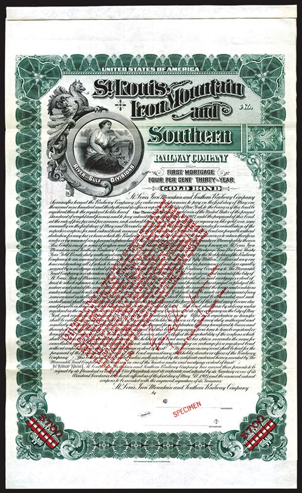 Missouri. $1000, Specimen 1st Mortgage 4% Gold Coupon Bond, Vertical format, black on green border and undertint, Allegorical woman on top left in circle with Gryphon on top, Overprinted in red diagonally with information on new payment terms, VF, International BNC. Unlisted denomination, color, bond design and year in Cox. Rare and very attractive.
