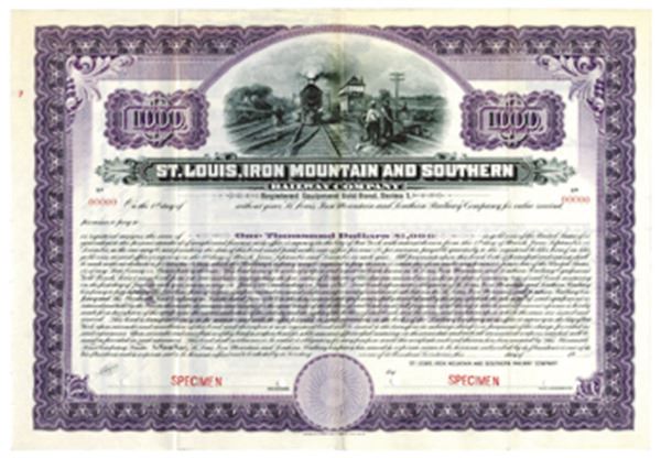 Missouri & Arkansas. $1000 Specimen 5% Series 1 Registered Equipment Gold Bond, Black print on purple border and under tint on horizontal format, Locomotive coming head on down the tracks with men at side making repairs, Specimen overprints and POC's, VF-XF condition, ABNC.