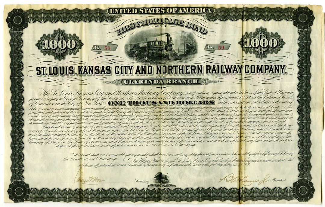 Missouri, 1879. $1000 I/U 6% First Mortgage Coupon Bond, Clarinda Branch, S/N 59, Black text with black border, Train passing on tracks at top center. Fine condition with staining along fold lines, NBN. Only listed in I/U format in Cox.