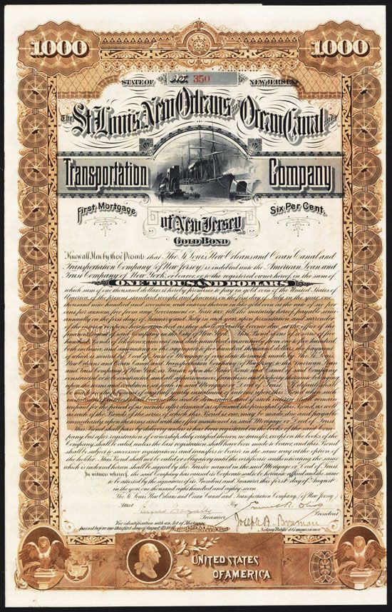 Louisiana, 1887, Incorporated in NJ, $1000, 6% First Mortgage Gold Bond, Issued and Uncancelled Bond, #350, Black on brown border and underprint, Steamship docked with passengers loading top center, VF-XF condition, HLBNC. Extremely attractive and rare bond.