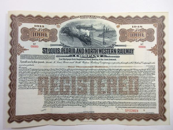 Illinois, 1913, $1000 1st Mortgage Gold Registered 5% Specimen Bond, Black printing with brown border and underprint, Locomotive passing under bridge with one moving on top, POC's and red SPECIMEN overprints, VF condition, ABNC. Unlisted railroad in Cox.