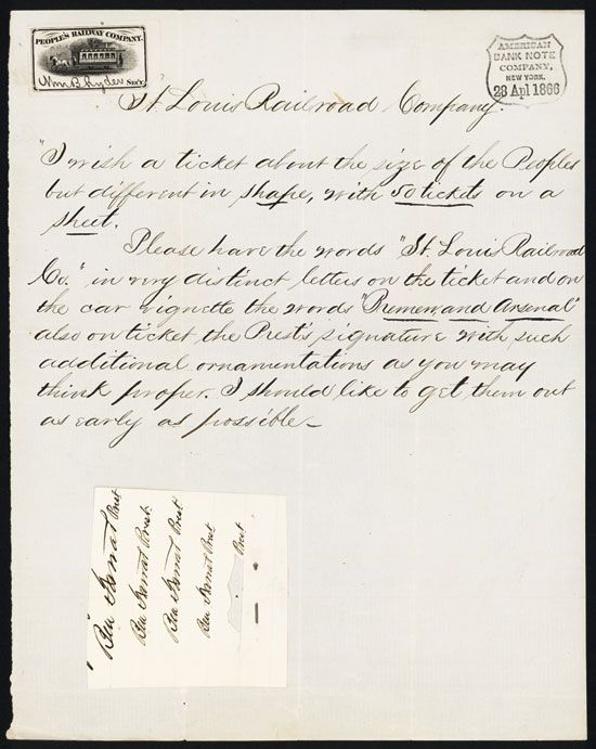 1866, Letter to ABN from St. Louis Railway Co. ordering tickets similar in style to a People's Railway Co. sample ticket attached, also samples of the president's signature, VF condition, ABNC.