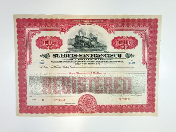 Missouri. $1,000 Specimen 4 1/2% Registered Consolidated Mortgage Gold Bond, Black print on red border and under tint on horizontal format, Locomotive at top besides factory, Specimen overprints and POC's, VF-XF condition, ABNC.