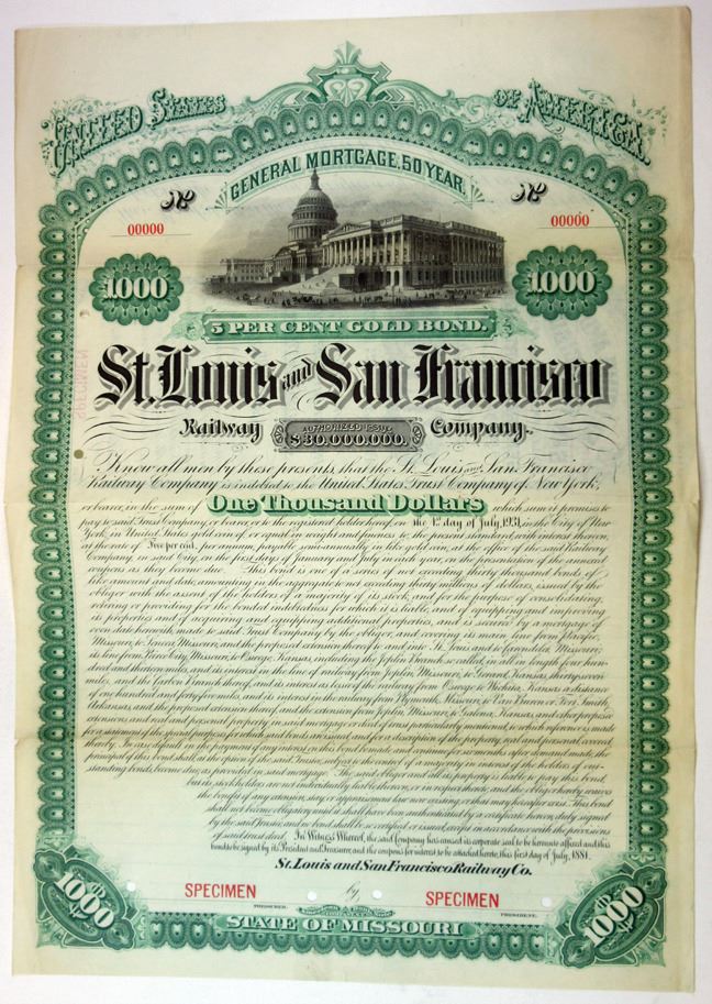 St. Louis, Missouri. $1,000 Specimen 5% General Mortgage Gold Bond, Black print on green border and under tint, Large building at top, Specimen overprints and POC's, Fine-VF condition with splitting and toning at fold lines, ABNC. Listed Railroad on Cox - Unlisted Bond design and date in Cox. Only 2 examples of this bond were found in the ABN Archives In 2002