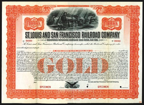 Missouri, 1900, $100 4%Registered Refunding Mortgage Gold Specimen Bond, Black printing with red border and underprint, Locomotive at turntable top center, POC's and red SPECIMEN overprints, VF-XF condition, ABNC. Listed railroad in Cox but unlisted bond denomination.