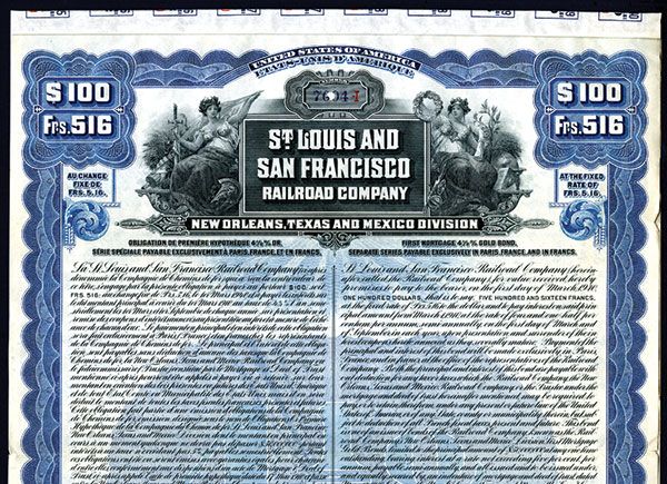Missouri. 1910. $100 or 516 Francs 1st Mortgage 4 1/2% Specimen Bond. New Orleans, Texas and Mexico Division. Black print on blue border and underprint. Two allegorical women flanking title top center. POC's and red SPECIMEN overprints. VF condition. ABNC. Bond in both English and French and payable only in Paris. Railroad and Bond listed in Cox.