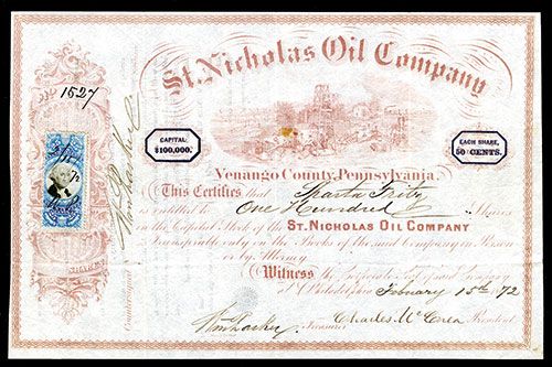 Pennsylvania, 1872, 100 Shares, Issued Stock, Pink on pink border and underprint, Vignette of oil wells and barrels, locomotives on right, VF condition, Moss & Co.