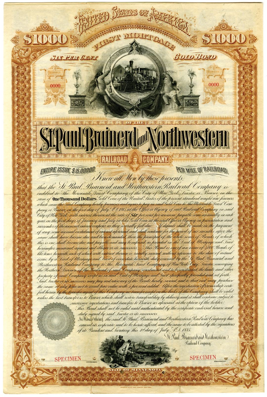 Minnesota, 1885. $1000 Specimen 6 % First Mortgage Gold Coupon Bond, Black text with ornate brown border and undertint, Train in circular frame flanked by cherubs at top center. Red specimen overprints, 0000 serial numbers, and POCs. Fine condition with Archival reinforcement of slight splitting at folds, ABNC. Only bond listed for the railroad in Cox. Only 1 example was found in the ABN Archives in 2002.