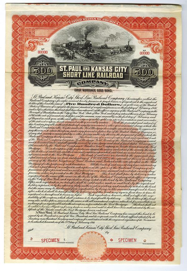 Iowa. $500 Specimen 4 1/2% 1st Mortgage Gold Coupon Bond, Black print on orange border and under tint, Locomotive at top passing men plowing field, Specimen overprints and POC's, VF-XF condition, ABNC.