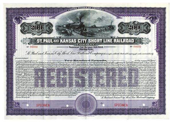 Iowa. £200 Specimen 4 1/2% Registered 1st Mortgage Gold Bond, Black print on purple border and under tint in horizontal format, Locomotive passing farmers working in field at top, Specimen overprints and POC's, VF-XF condition, ABNC.