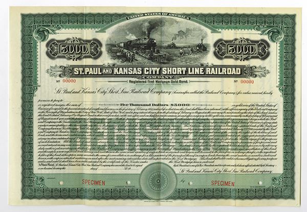 Iowa. £100 Specimen 4 1/2% Registered 1st Mortgage Gold Coupon Bond, Black print on olive green border and under tint on horizontal format, Locomotive at top passing men plowing field, Specimen overprints and POC's, VF-XF condition, ABNC.