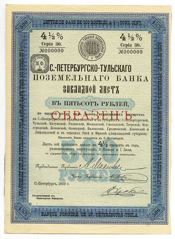 Imperial Russia, 1909, specimen 500 Ruble 4.5% bond, small size certificate with no coupons attached, series 30 serial 000000, overprinted "________" in red (Russian for specimen), bank seal at top, ornate blue frame, text in multiple languages including Russian, French, German, English, and others. Extra Fine.