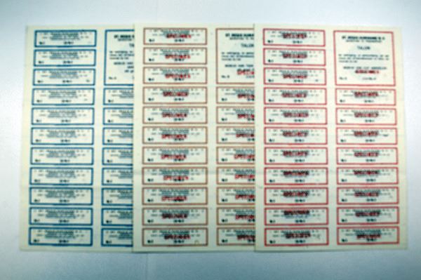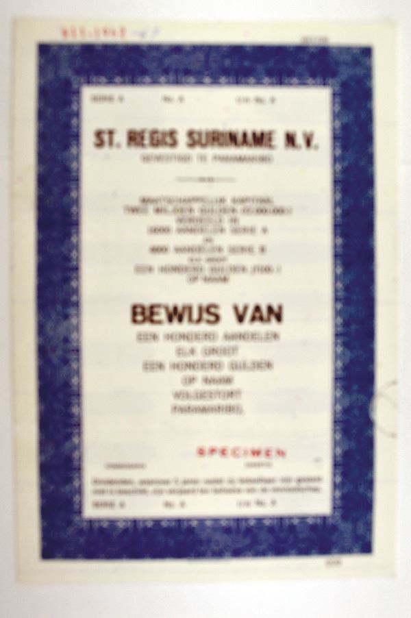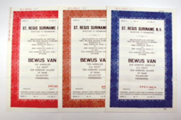 Suriname. Lot of 3 Specimen Share Certificates. 5, 10, 100 Gulden. Specimens. Red, brown and blue in color. Specimen overprint on each. VF. 3 pieces. ABNC.