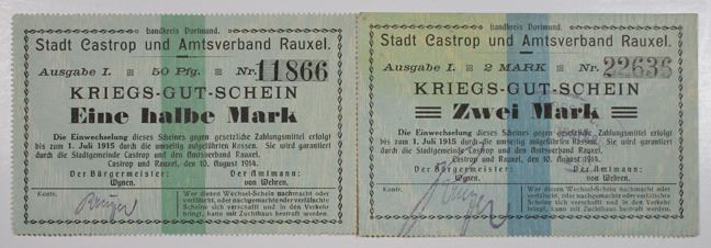 Germany. 1914. Lot includes a pair of 1/2 Mark and 2 Mark Notgeld issued by the City of Castrop and the district association of Rauxel. About to Choice Unc. (2)