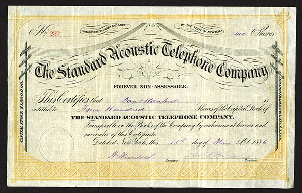 New York, Mar. 18th, 1886, 400 Shares, I/U, black on yellow border, telephone poles on left and right with wires on top, S/N 237, VF, attractive and rare and extremely early for telephone companies. From a new estate find.