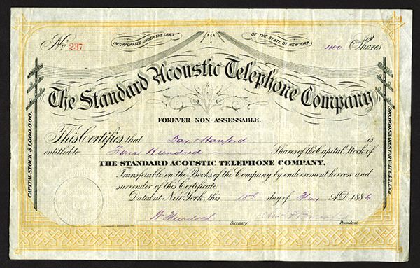 New York, Mar. 18th, 1886, 400 Shares, I/U, black on yellow border, telephone poles on left and right with wires on top, S/N 237, VF, attractive and rare and extremely early for telephone companies. From a new estate find.