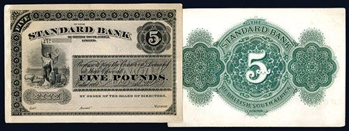 South Africa, 18xx (1870's), 5 Pounds, P-S580, Unlisted Front and Back proofs, Standing Britannia at left with flag, shield and sheep, Black on very light brown filigree-cameo pattern underprint, the listed note does not have the underprint, the back uniface proof is printed in green instead of listed red, there is a very slight thin on the upper left corner of the face that is away from the printing, otherwise the note would grade Uncirculated, Very small Waterlow & Sons, Ltd. imprint on lower left below Britainnia. Very rare if not unique proof that differs significantly from the listed variety in SCWPM. W&S.