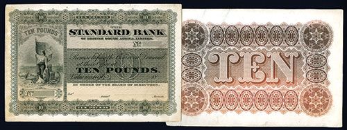 South Africa, 18xx (1870's), 10 Pounds, P-S581, Unlisted Front and Back proofs, Standing Britannia at left with flag, shield and sheep, Black on very light brown filigree-cameo pattern underprint, the listed note does not have the underprint, the back uniface proof is printed in orange-brown instead of listed red, there is toning on the left border and the right border has evidence of a light vertical fold on the border that is difficult to see relegating this lovely note to an Choice XF to AU condition, Very small Waterlow & Sons, Ltd. imprint on bottom middle border area. Very rare if not unique proof that differs significantly from the listed variety in SCWPM. W&S.