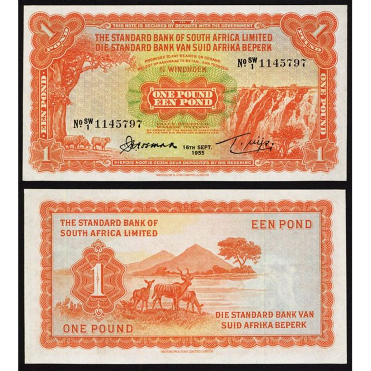 Southwest Africa, 16th Sept., 1955, 1 Pound, P-11, Issued banknote, Orange on green and m/c, waterfall on right, back orange with kudu and mountains, S/N SW 1 1145797, Choice VF to XF condition with the appearance of a higher designation with bright colors, sharp corners fresh appearing paper but possibly pressed in the past, still a very attractive note. W&S.